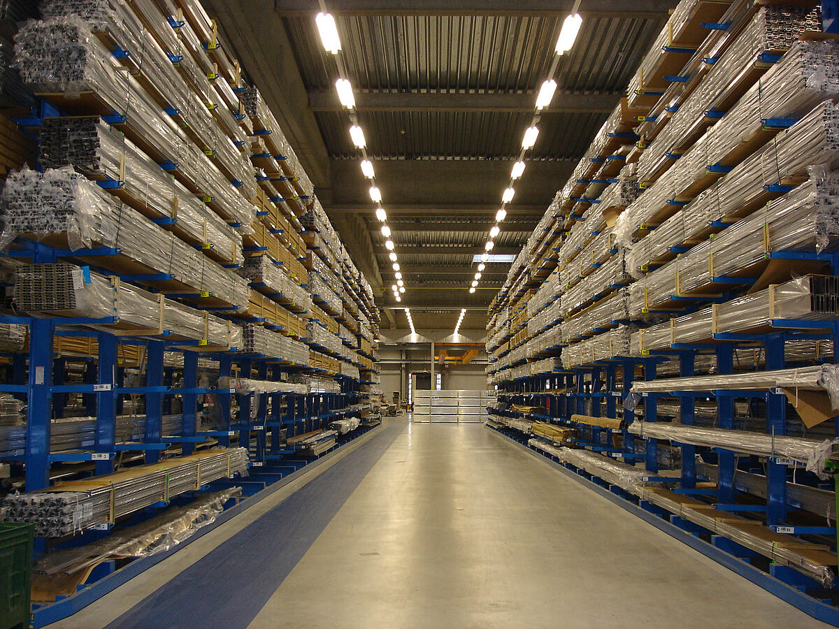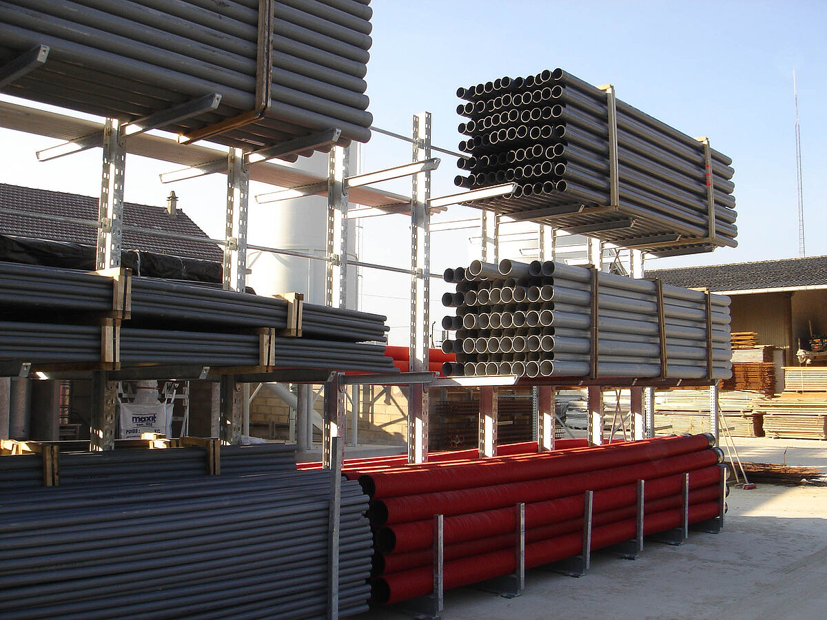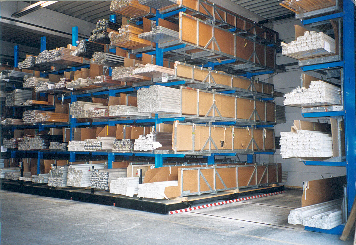 For the storage of aluminum and plastic, cantilever racks are the ideal storage solution for long goods of any shape, length or quality. With this racking system, aluminum and plastic profiles, PVC pipes and panels, downpipes, window frames, guttering and miscellaneous long goods can be stored and removed in a particularly space-saving manner.