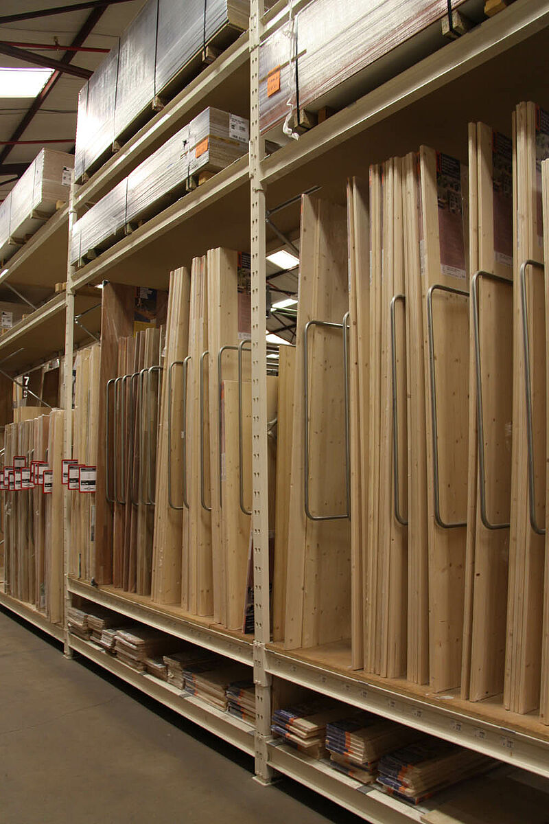 Cantilever racking in particular is the ideal storage system for long, heavy and bulky materials in the timber trade. OHRA cantilever racking creates high density storage capacity on a small footprint thanks to the sturdy but slim hot-rolled steel profile construction. Continuous storage levels without interfering intermediate uprights enable various product sizes and assortments to be stored on one level. Flexible boltless height-adjustable cantilever arms protect product and racking from forklift truck impact damage. OHRA cantilever racking is made to order to fit your warehouse and product storage requirements