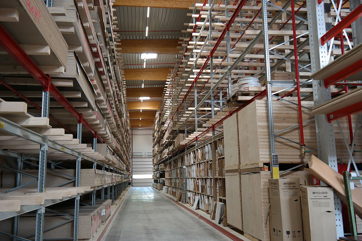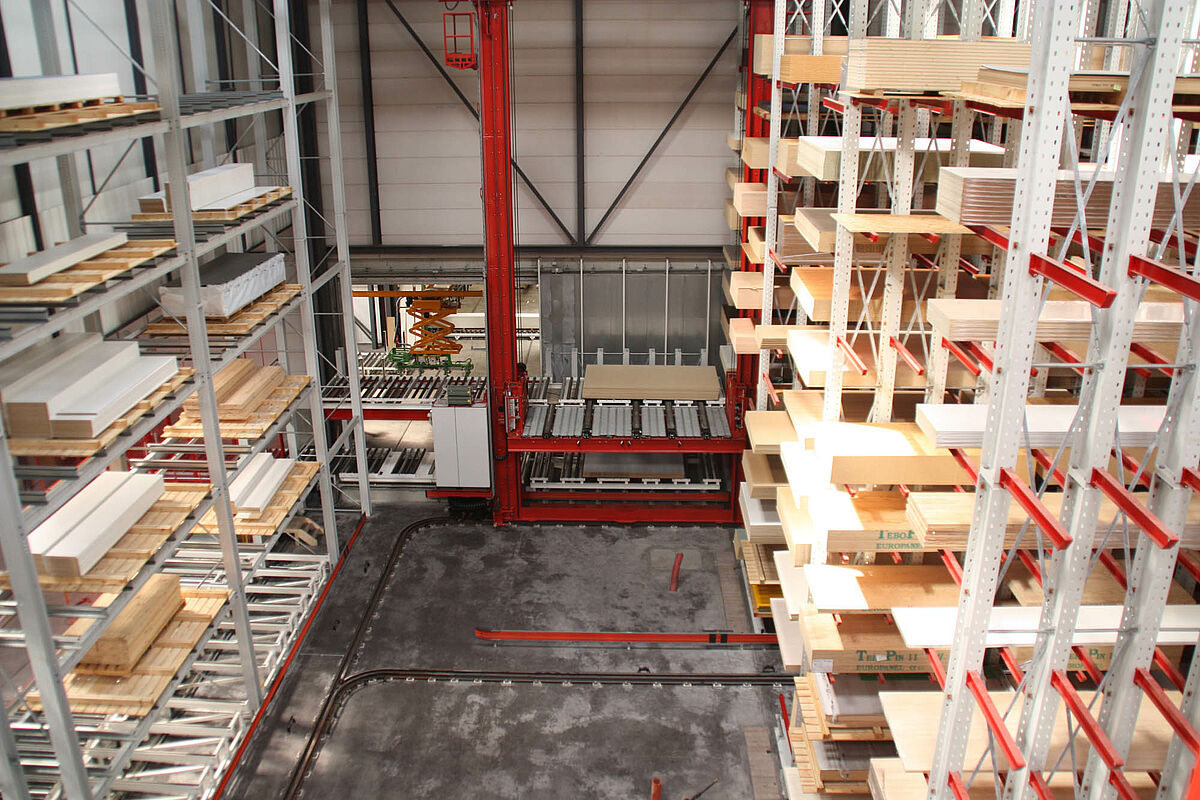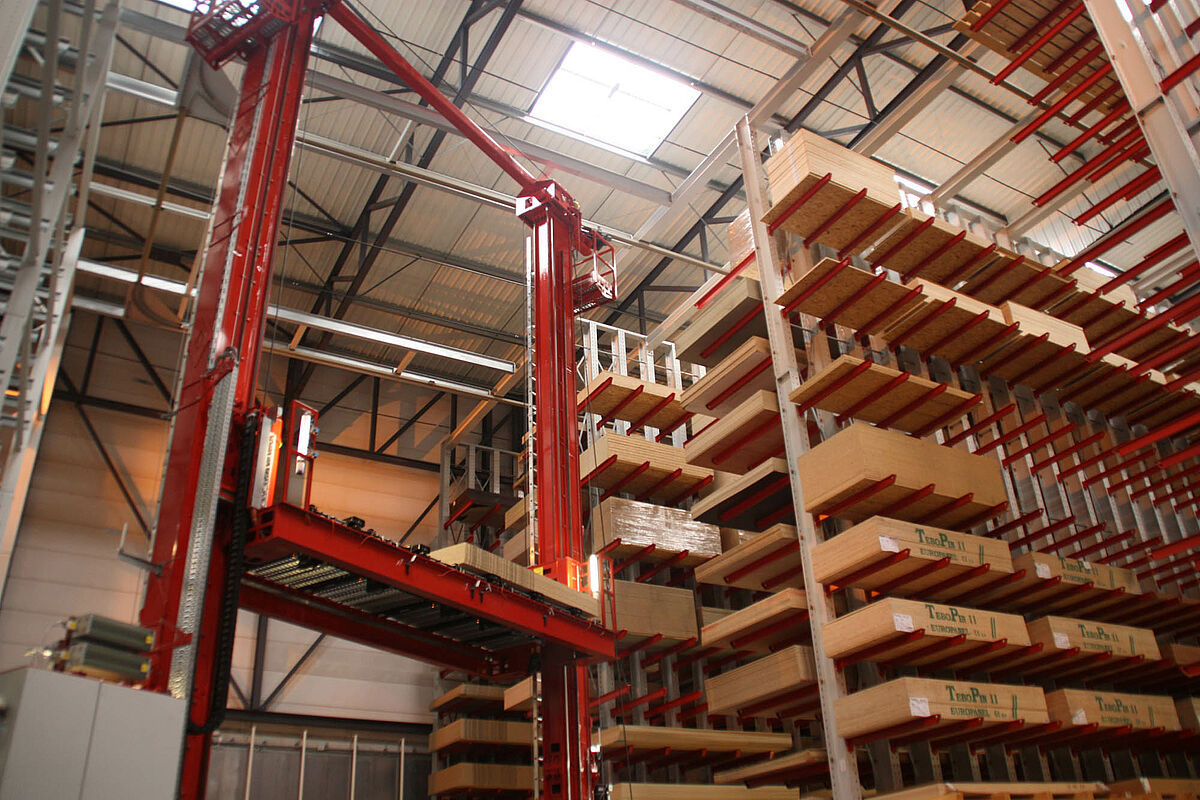 Storage optimization through the partial and full automation of loading and unloading processes. With high picking capacities, performance increases according to the “goods-to-man” principle. Depending on the requirement, whole packages or single panels can be taken and transported to the transfer station.