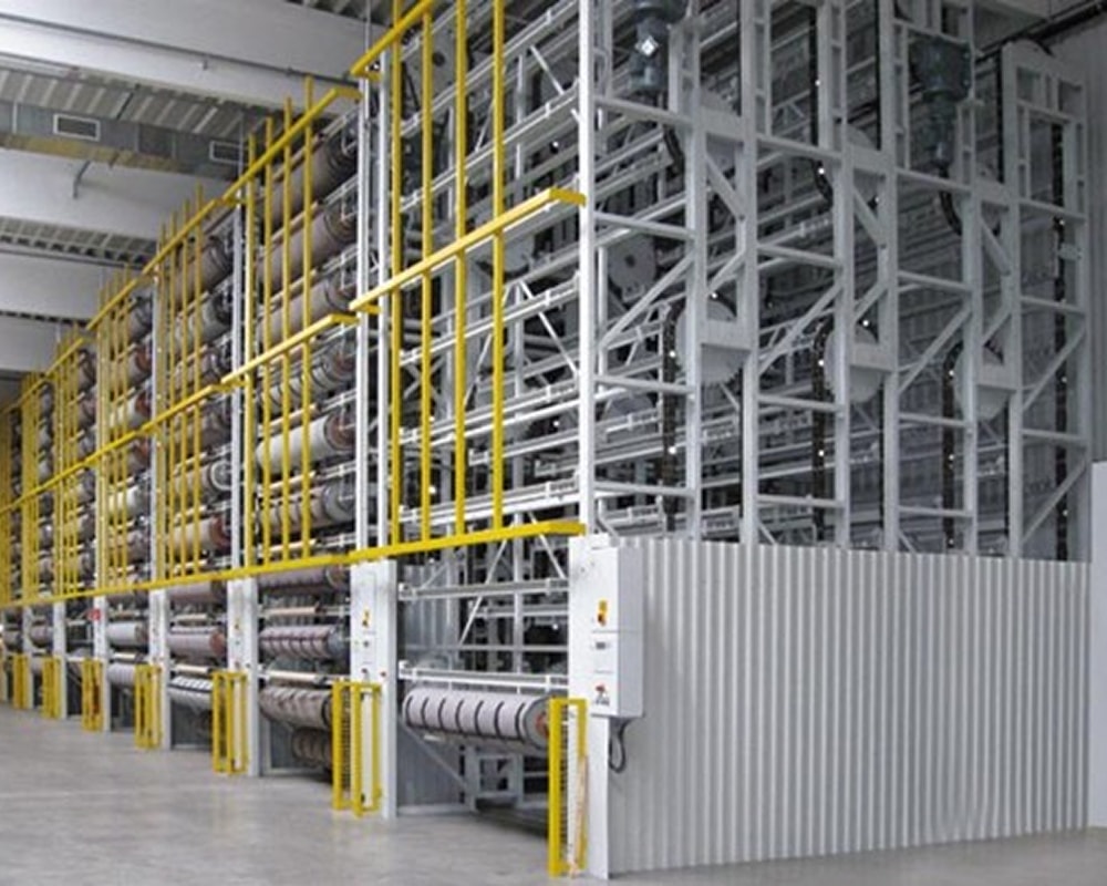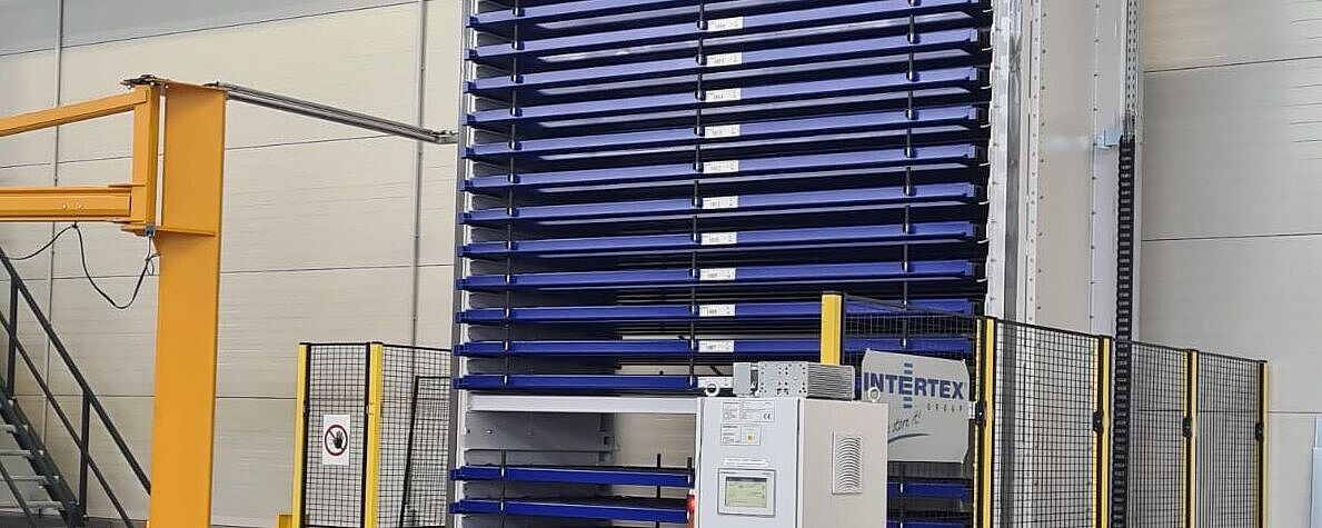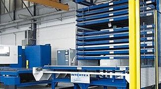 The InterMat system is an automated carousel storage system operating on the paternoster principle. Stored goods are delivered to the operator at the push of a button—quickly, reliably, and without manual searching. Typical applications include storage of long goods, cable drums, cylinders, or rolled materials.