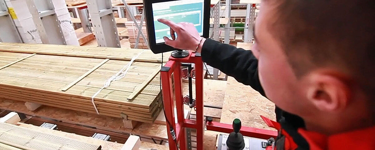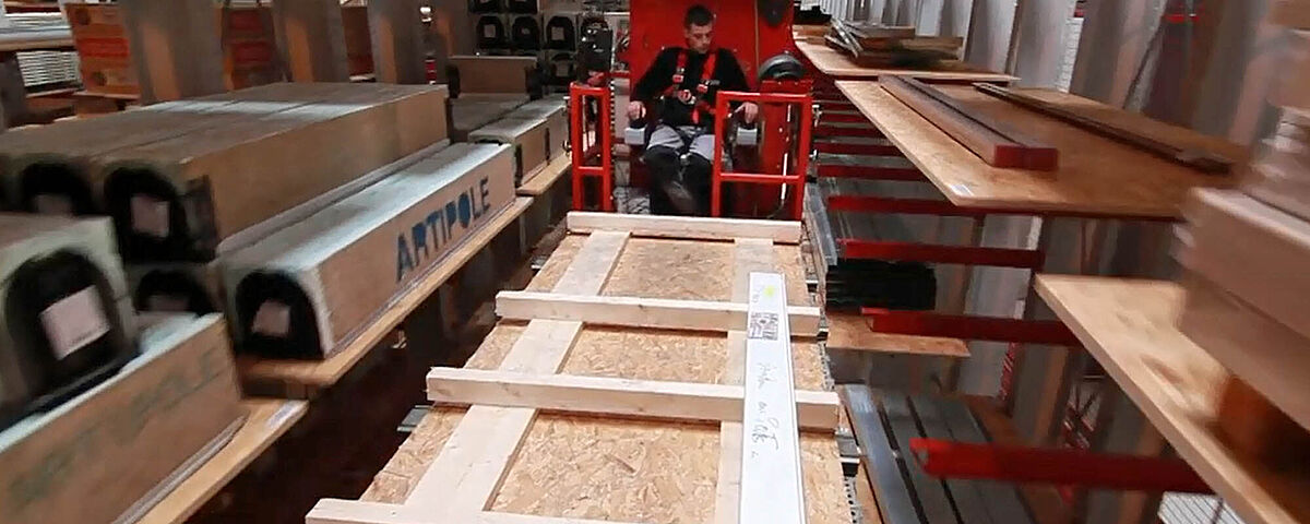 The SRM moves automatically to the racking position determined by the operator in advance. The precise positioning in front of the racking position is fully automatic, while the on- and offloading of e.g. wooden boards is controlled by the operator over a manual command. This is also the case for the raising and lowering of loads and for the direction of movement of the forks.
