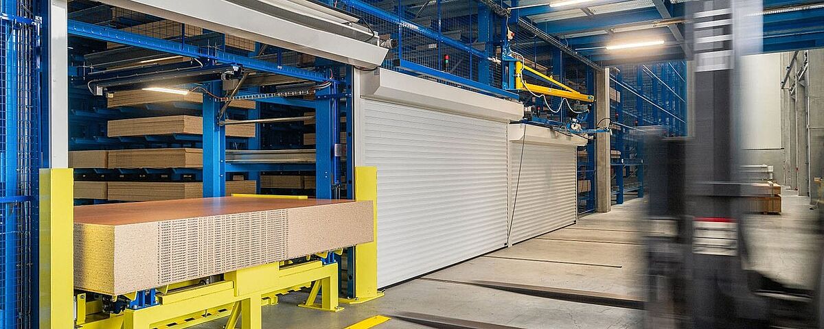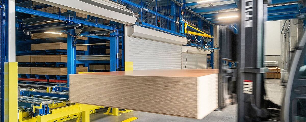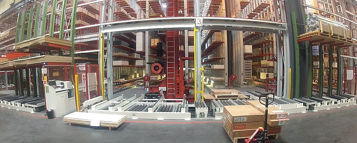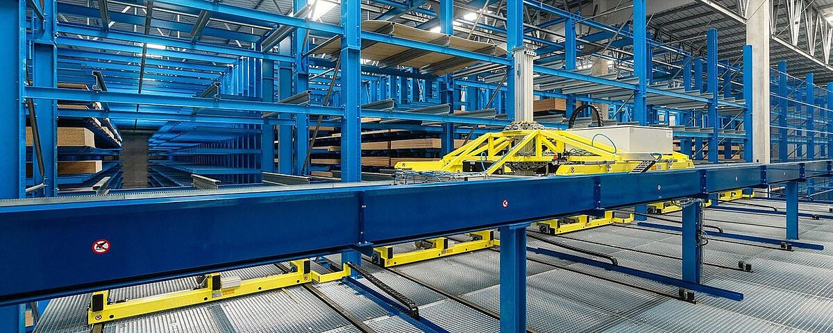 Storage and retrieval, picking and provision of the order-related packages are fully automated. This not only increases the efficiency of the entire storage and order picking process, but also enables a high area utilisation and reduces damage to the goods. The concept of using the advantages of two-stage picking is completely new: A storage and retrieval machine (SRM) handles the storage and retrieval of packages in the warehouse. If a shipping order requires the picking of different individual sheets, a vacuum manipulator has the corresponding articles ready for shipping, whereby several orders can be processed in parallel. Thus, two separate systems put the orders together very efficiently in the smallest of spaces.