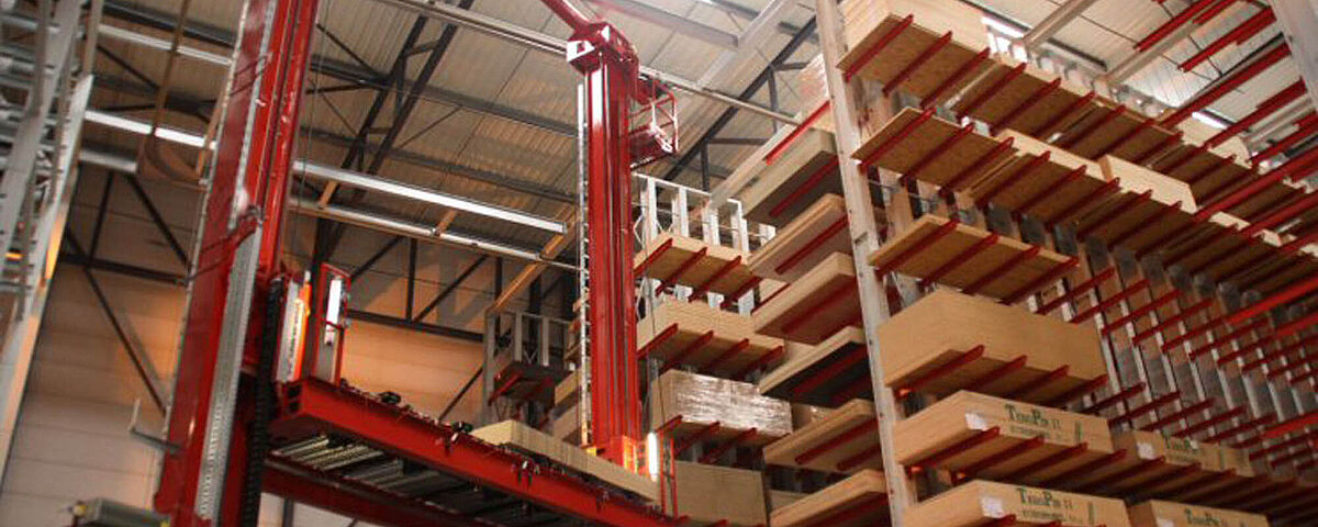 A stacker crane is a rail-guided vehicle for handling goods in an automatic racking system. The maximum height of a stacker crane is 46 metres. Depending on the stored goods, weight and dimensions, a distinction is made between different types of stacker cranes. Three of them are described below: