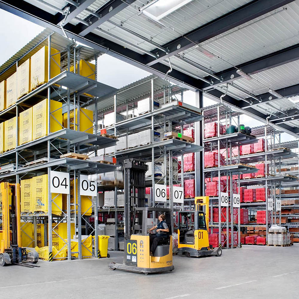Pallet racking systems are by far the most widely used storage systems for many applications. In addition to conventional storage of goods on different types of pallets (e.g. Euro or industrial pallets) these racks are also suitable for accommodating other storage aids such as pallet cages or heavy tools. Pallet racking are used in many sectors and industries, for example in the building materials trade, haulage and transport companies, in dispatching warehouses or as a single storage system for heavy goods.