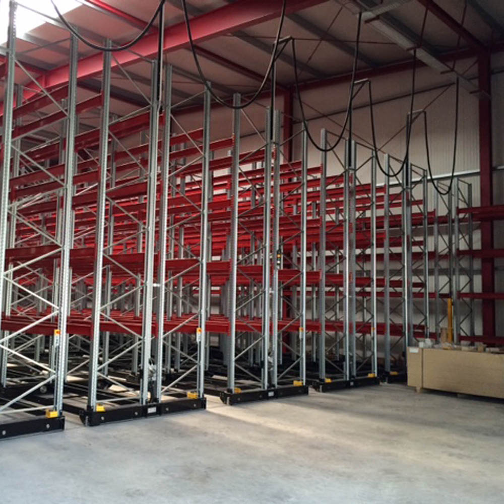 Movable pallet racks are dynamic racking systems and are suitable for palletised goods that require compact storage with a low footprint. With this storage system, the robust pallet racks are installed on torsion-resistant moving trolleys. The complete rack is moved as a single racking unit by means of either electronic or manual control. The trolleys are moved on rails, which can be implemented both in new systems and retrospectively in existing floors. In this way, only one active aisle is required per rack run of the pallet rack. This results in a high degree of utilisation of the available space since only one aisle is open, i.e. in the position where goods are stored into or retrieved from the rack.