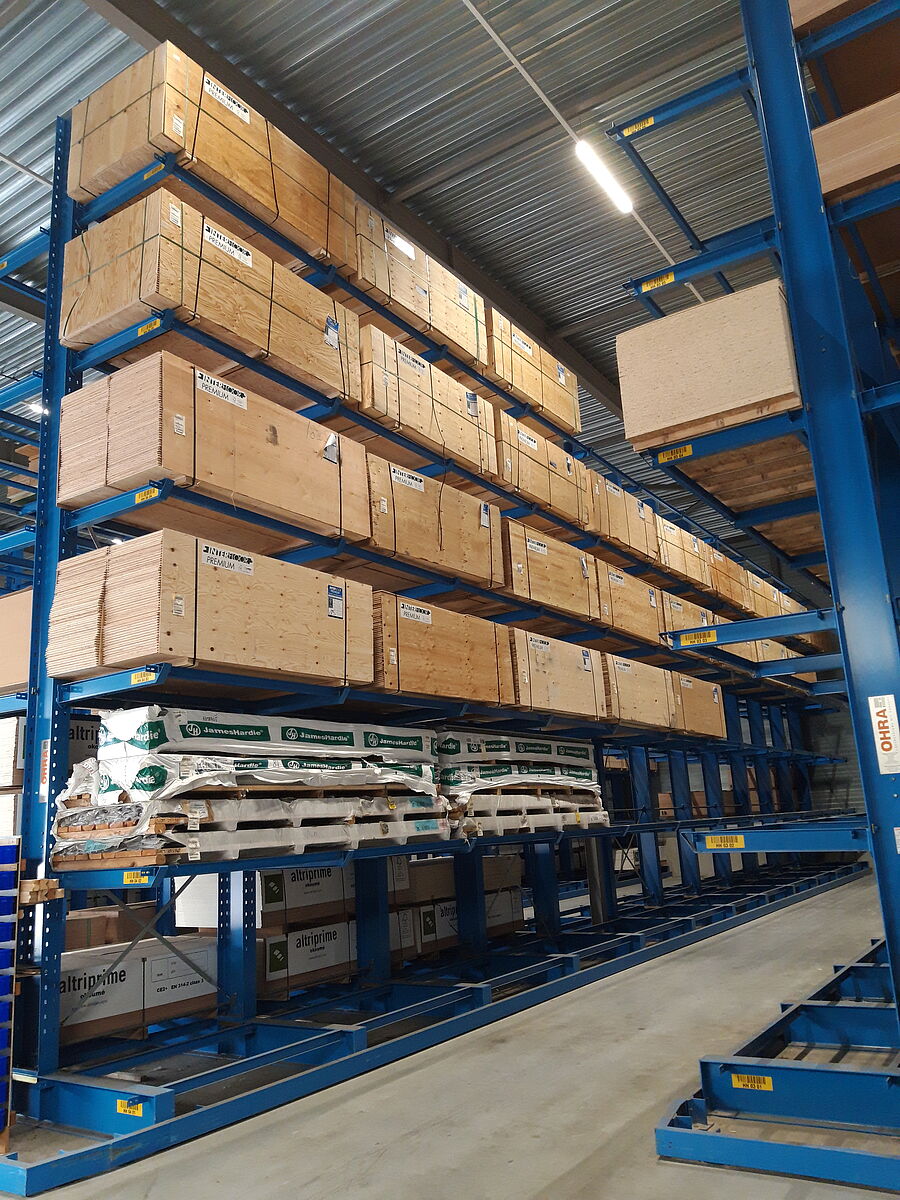 4PLUS Bouwmaterialen B.V., a purchasing organisation for the 59 associated independent builder's merchants, has more than doubled the capacity of its central warehouse in Born, in the Netherlands by installing OHRA cantilever racks. Whereas previously, building materials such as wood battens, beams and dry construction boards were stored in blocks on the warehouse floor, the 8,470mm racks now enable the warehouse space to be fully utilised up to a height of around 10 metres. Not only does this provide more storage space, it also greatly simplifies the whole handling process of building materials, improves safety for the warehouse staff and minimises damage to the materials.