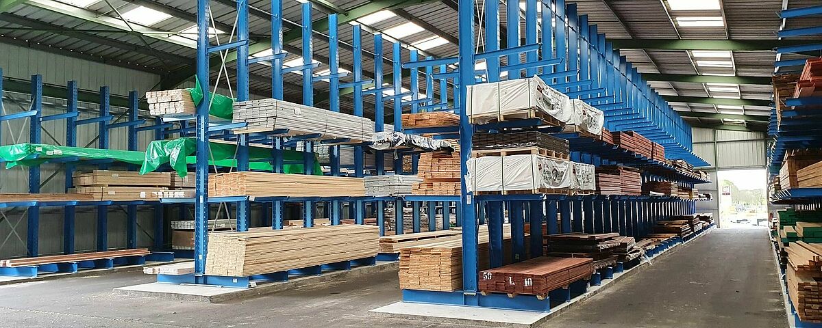 The French building materials trader Bois Du Poitou has modernised its existing warehouse for timbers and panels at its headquarters in Soudan: Instead of storing the wooden goods on the floor as before, they are now directly accessible in two double-sided as well as two single-sided cantilever racks from OHRA. Bois Du Poitou can thus make much better use of the existing building, significantly reduce access times to goods and triple the storage capacity.