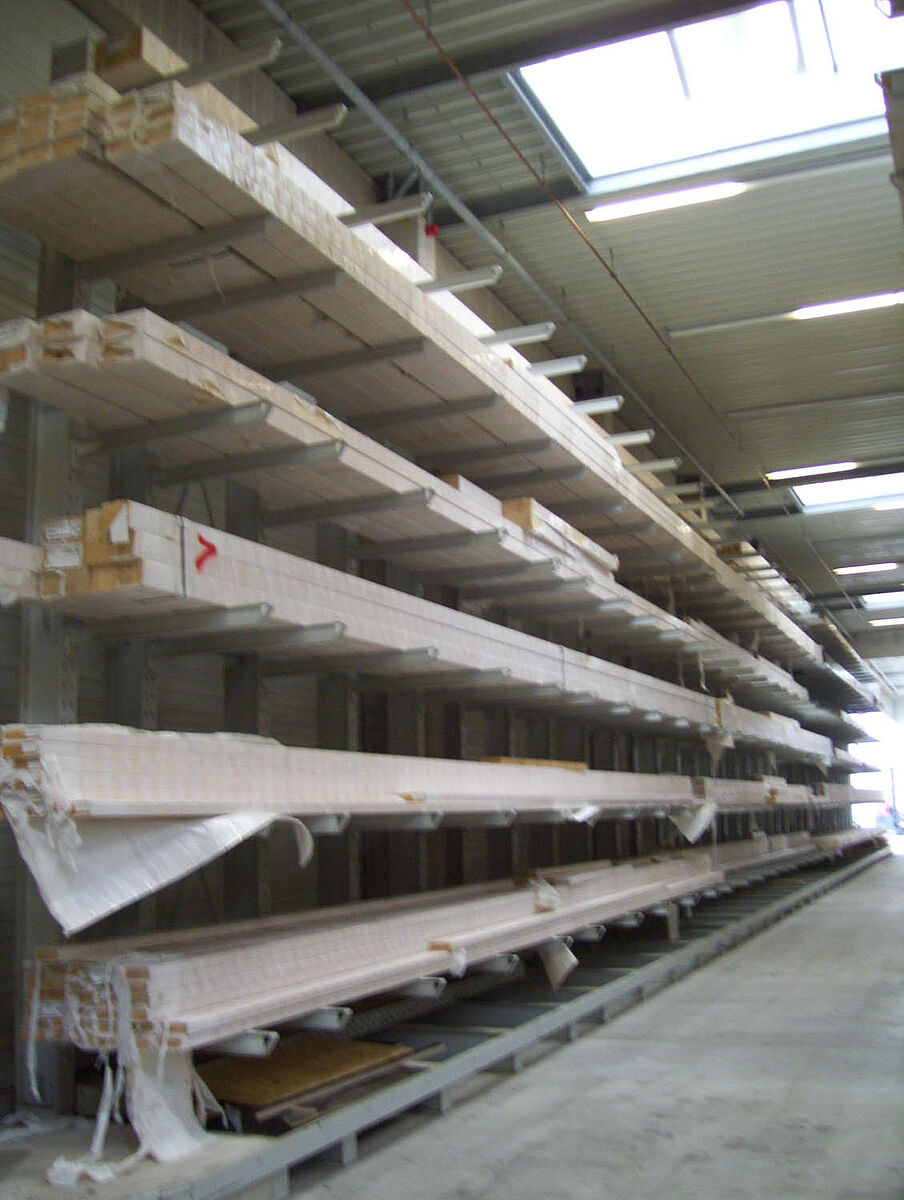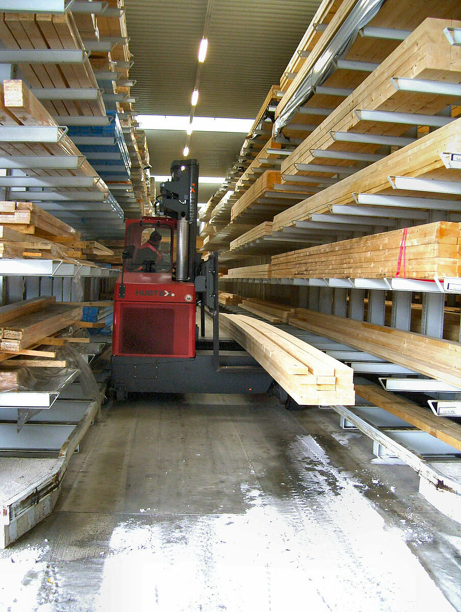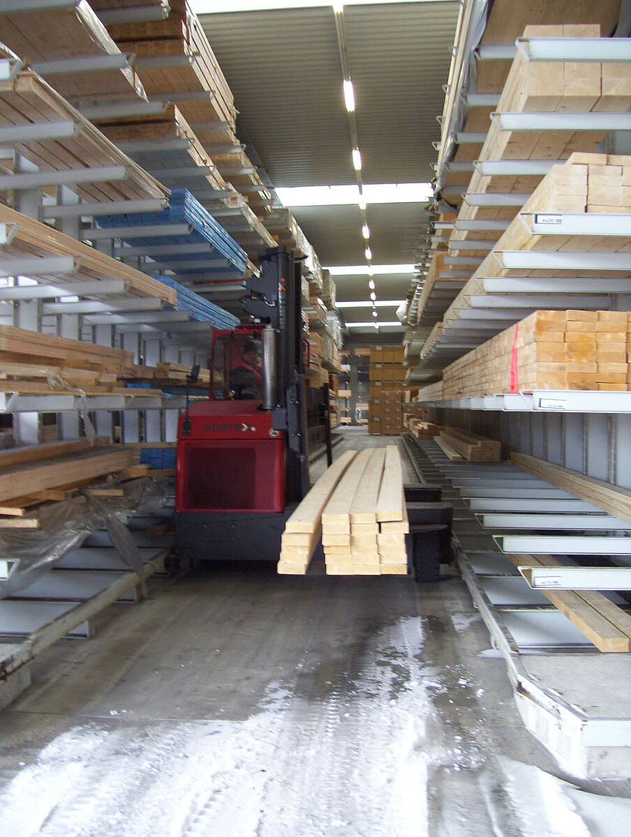 The specialists from Kerpen assembled the 236 storage spaces for solid construction wood and glued laminated timber composed of rows of 40 and 50 meter-long and 6.2 meter high cantilever racks in just two weeks. Thus, a total of 2,800 meters of racking was installed for long timber. An additional 300 storage spaces were also created using pallet and cantilever racks for the storage of pallet goods and the basic range of supplies. The warehouse is served by two Hubtex side-loading forklifts and one Linde front-loading forklift. In the first six months following commissioning alone, around 3,300 cubic metres of wood were sold.