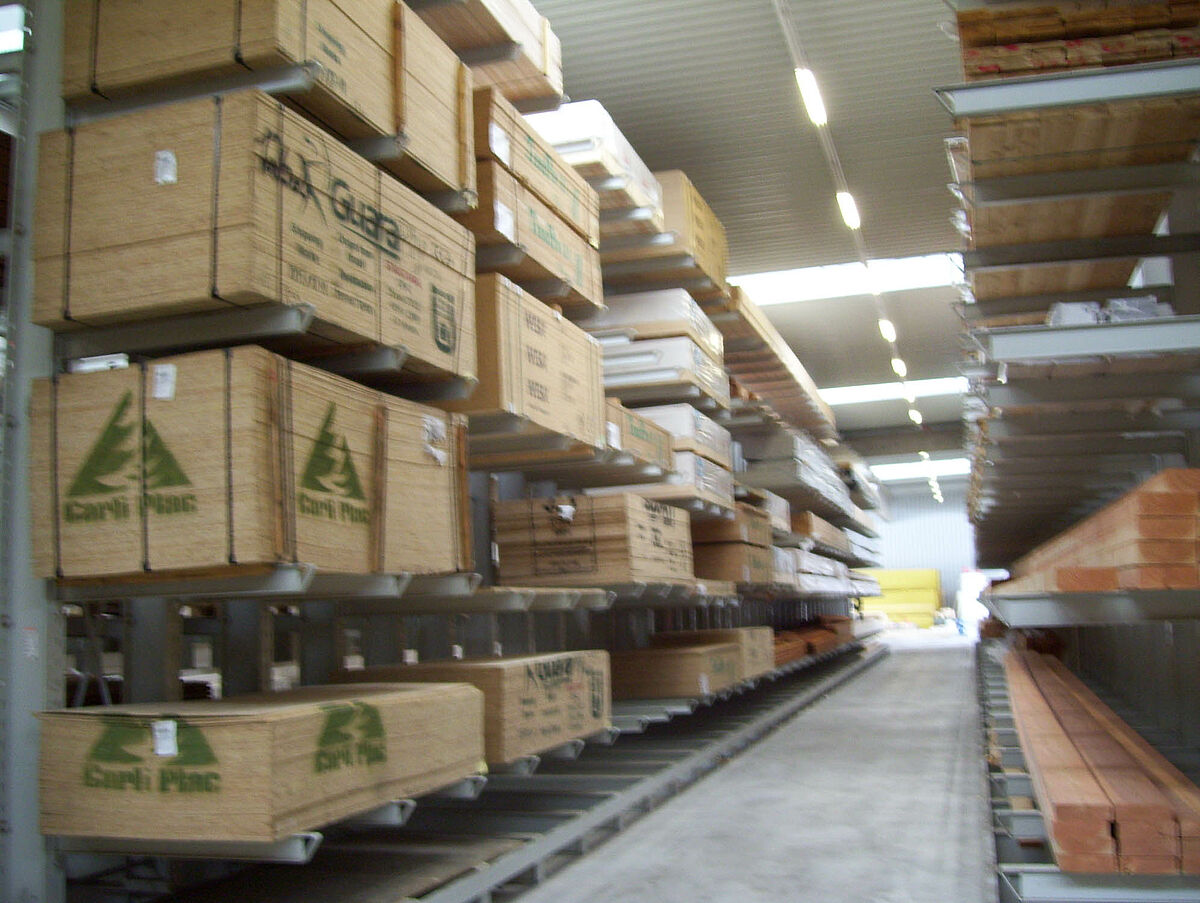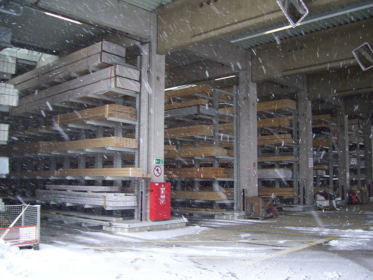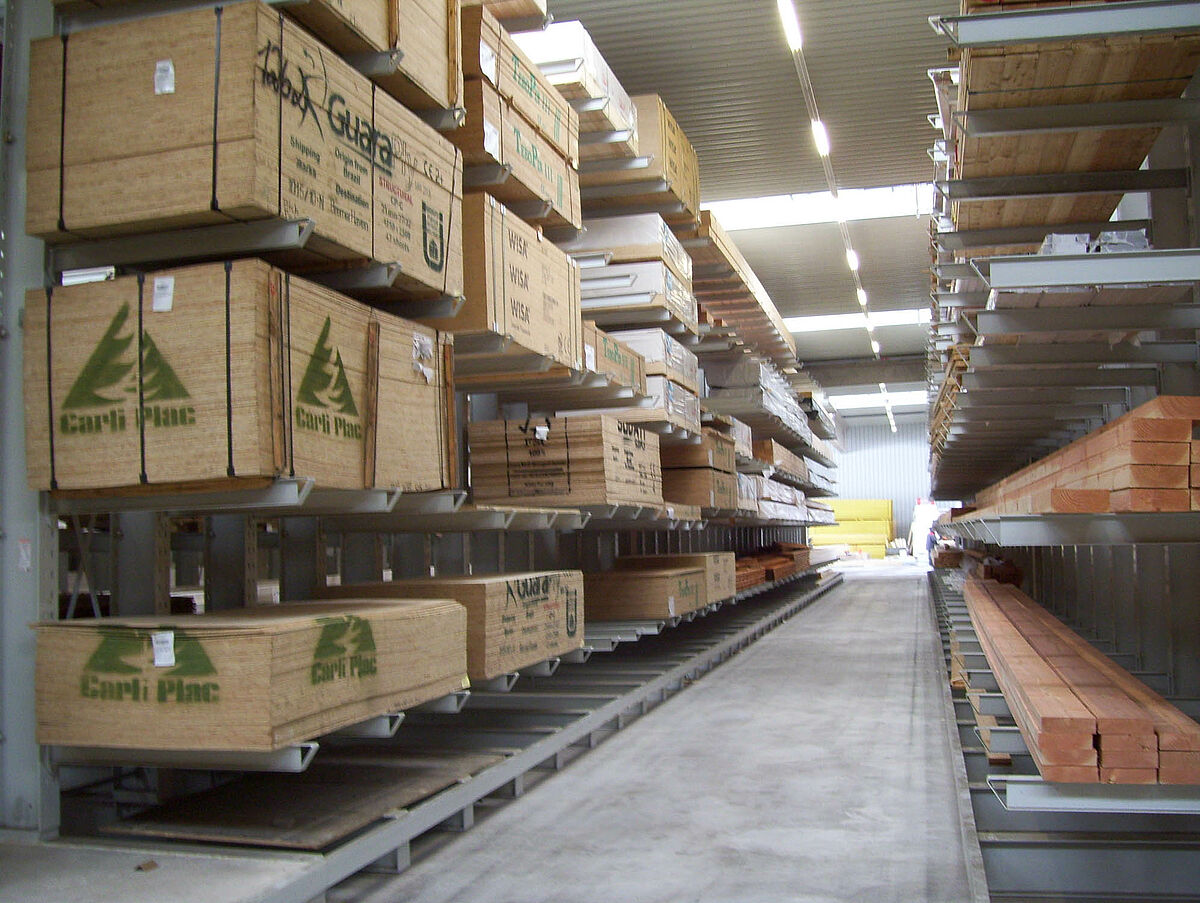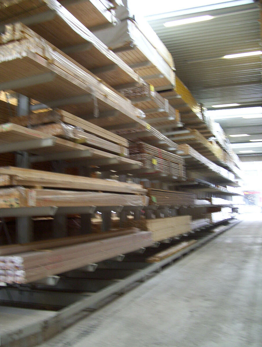 The specialists from Kerpen assembled the 236 storage spaces for solid construction wood and glued laminated timber composed of rows of 40 and 50 meter-long and 6.2 meter high cantilever racks in just two weeks. Thus, a total of 2,800 meters of racking was installed for long timber. An additional 300 storage spaces were also created using pallet and cantilever racks for the storage of pallet goods and the basic range of supplies. The warehouse is served by two Hubtex side-loading forklifts and one Linde front-loading forklift. In the first six months following commissioning alone, around 3,300 cubic metres of wood were sold.
