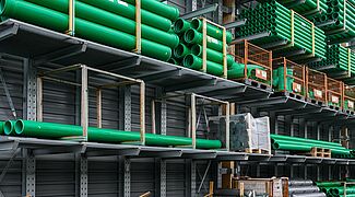 Due to the different materials, OHRA equipped the storage areas with both cantilever and pallet racking. A total of 22 single and double-deep racks with a height of up to 7,500 millimetres were installed. Each rack is individually configured for the different goods in terms of load capacity, number of storage levels and accessories. While the indoor racking is painted in the desired colour, the outdoor racking is galvanised to protect it from the elements. Some of the racking units are fitted with support posts or grids for maximum flexibility when storing items of different sizes. Another special feature is the end rack of the hall: It has been designed to accommodate a sheet piling between the racking uprights, thus forming the rear wall of the building.