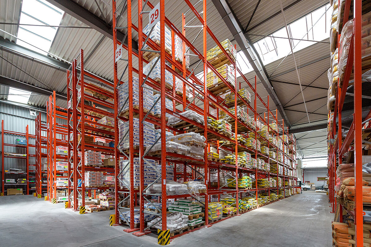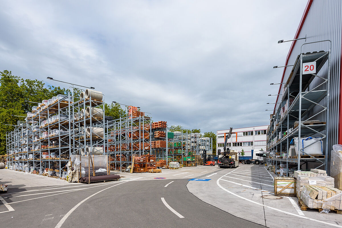Because Lörrach is in a seismic zone 3, the framework and footplates of the new racking by OHRA have been calculated so that they can carry the additional loads safely. The fact that all the load-bearing parts of the OHRA racks have been manufactured in hot-rolled steel profiles and not sheet metal profiles gives them an inherently high load-bearing capacity. In addition, the uprights will not buckle under lateral strain, even if touched by a forklift truck. Since several of the runs of racking in the outside area are located on a slope, the OHRA experts also designed pallet racks, mounted in stepped layers. Special spacer plates between the racking feet and the mounting plates on the floor, level out additional height differences. The racking in the warehouse, open at one end required a greater calculation effort since an opening of more than 30 percent on one side of the warehouse meant that wind forces had to be included in the calculation.