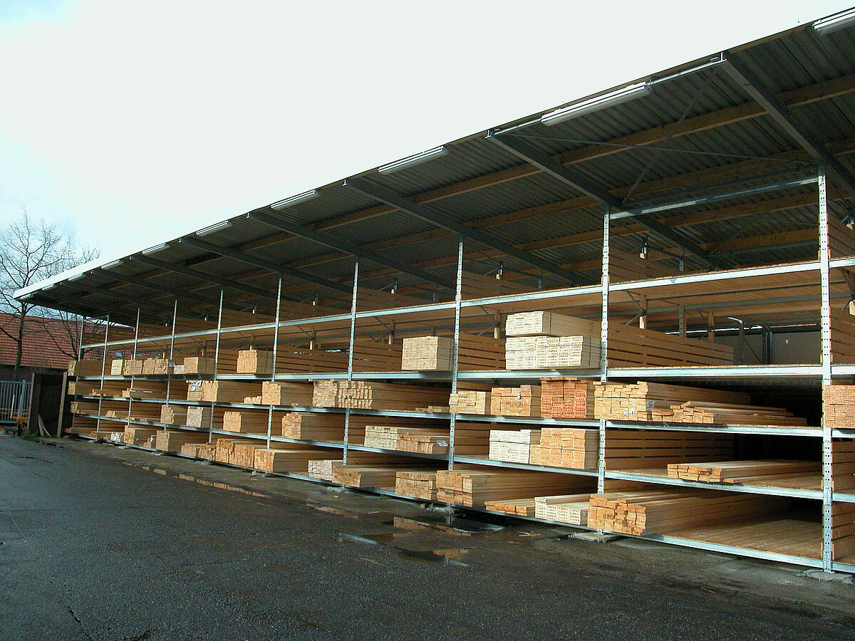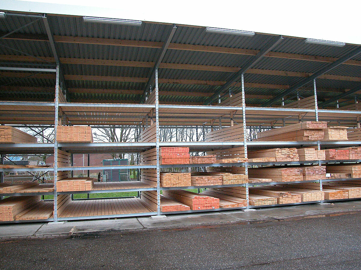 The new warehouse was realised by OHRA. The company based in Kerpen, Germany, is specialised in rack solutions for building material and wood merchants. In the case of Gooskens the palette rack system from OHRA was employed. In order to achieve the required storage depth the experts from OHRA connected a number of frames from the rack system in series, fitting them with wooden shelves. The frames are from hot-rolled steel profiles which yield elastically in the event of collisions while still retaining their high vertical load capacity. A roof on the construction protects the stored wood from the weather, turning the rack warehouse into a freestanding building. The new warehouse has an overall height of 6 meters and a length of 120 meters. The five storage levels have a load bearing capacity of 2,800 kilos respectively.