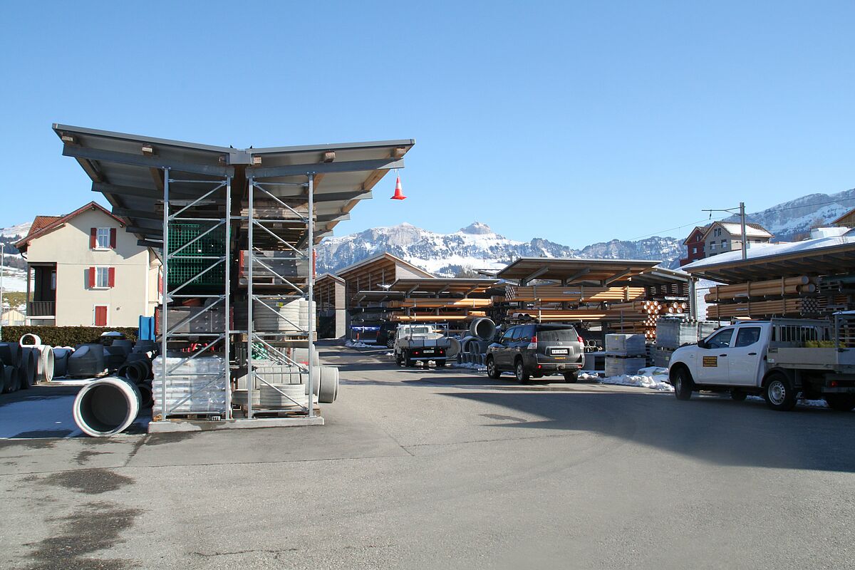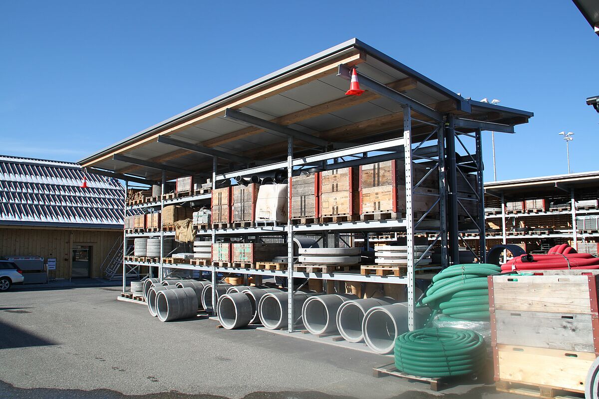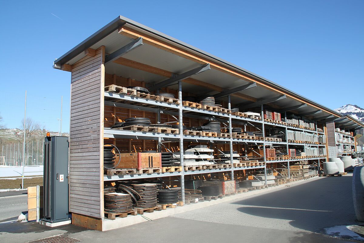The pallet and cantilever racks installed externally are equipped with a roof to protect the stored goods; OHRA provided the uprights and the corresponding roof arms, and the roof covering was supplied by a local building firm. In doing so, OHRA designed the statics of the racking to withstand the high snow loads to be expected in Appenzell of up to 484 kilograms per square metre, and wind loads of up to 110 kilograms per square metre.