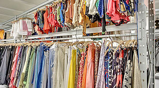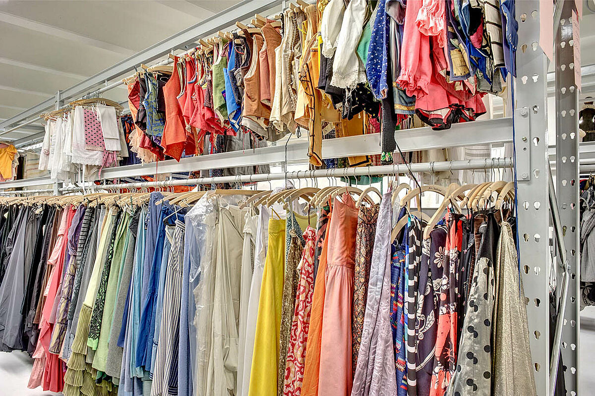 The adjacent three-story warehouse is the other stage prop such as furniture, lamps, decoration articles, and so forth is reserved. An entire floor is reserved for the costumes, shoes and accessories. No wonder, since only the costumes hang closely together at about 2,400 per meter. Dress shelves. In addition, there are the shelves for shoes, hats and other equipment parts.