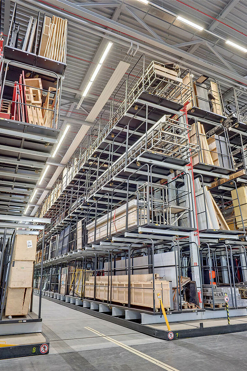 The 8 movable double shelves of nearly 60 m in length have a capacity of 180 tons each. The backdrop will be in- and outsourced by means of a four way forklift with a retractable cabin.